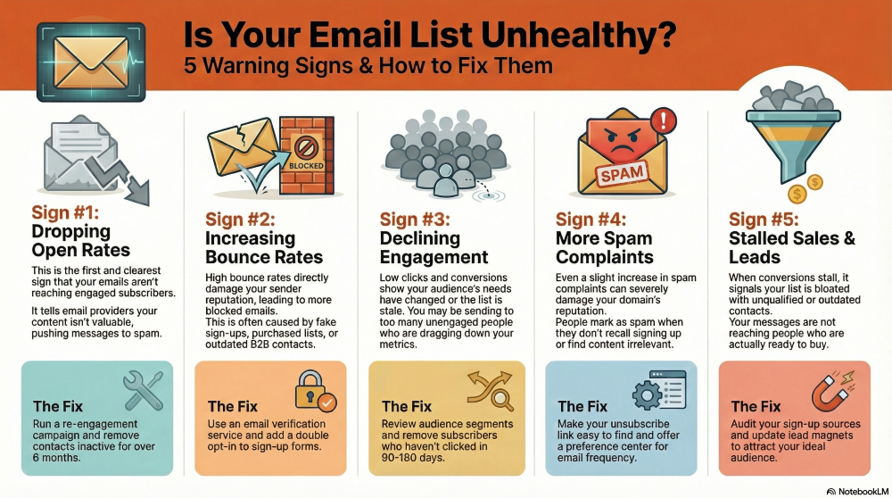 Below are five major signs your business email list needs a refresh — plus why each one matters and how addressing them can boost everything from open rates to revenue..